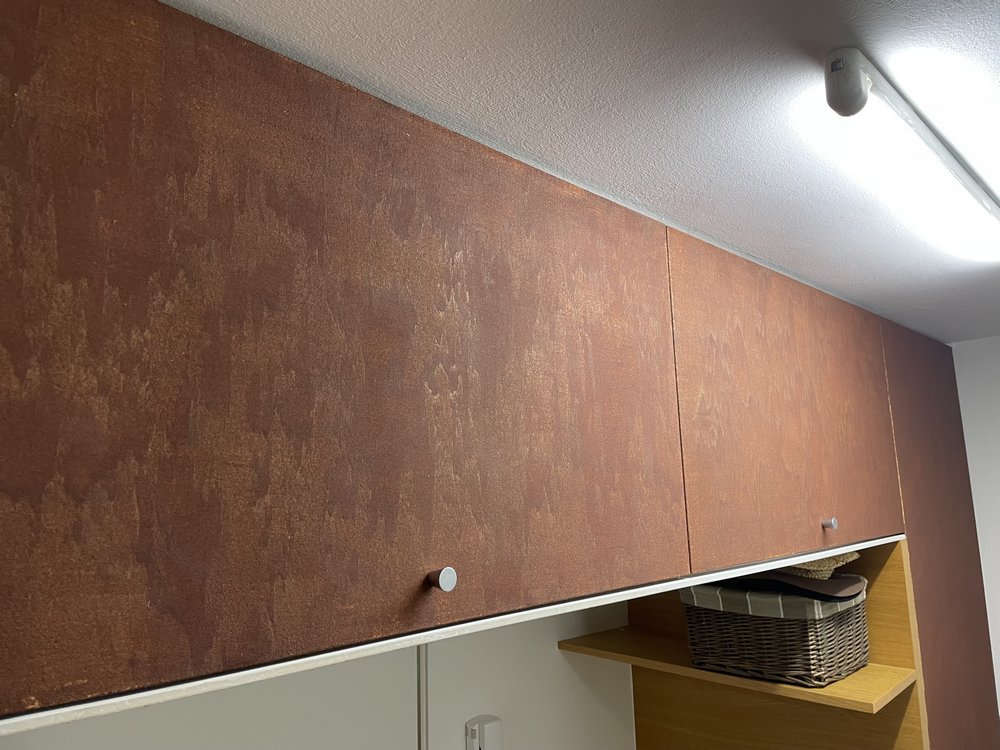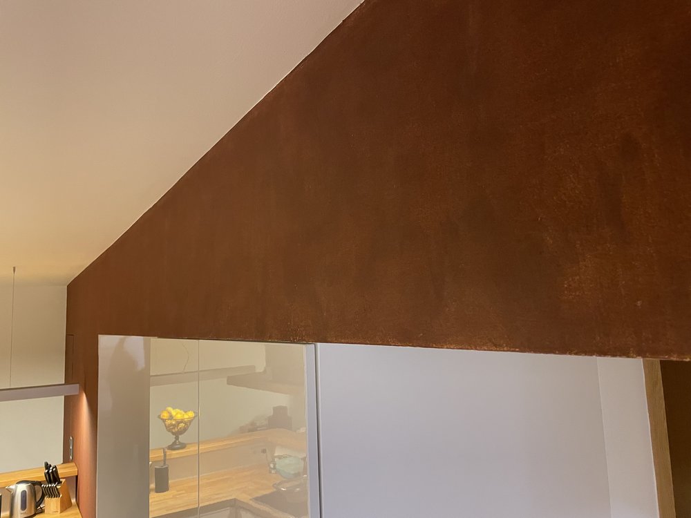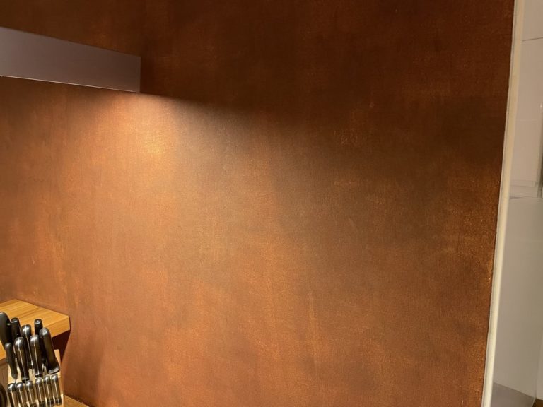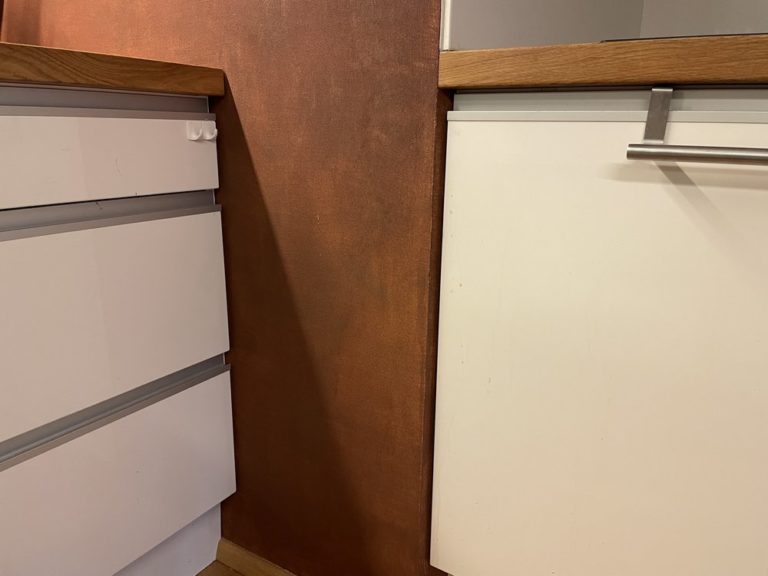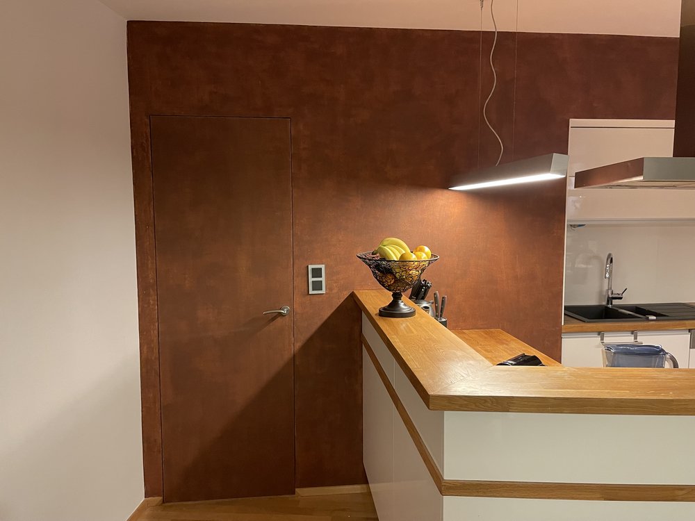 stěrka s efektem zriv kuchyni a na dvířka skříněk v chodbě Stěrka imitující rezavý plech byla použitá místo původní měděné tapety, která se začala po několika letech odlupovat. Realizace:11/2021, Praha Použitý materiál:Italský materiál Valpaint Klondike Corten „Pana Brabce můžu doporučit….„ investor hledáteněco podobného JSME NA TEL: +420 792 769 735